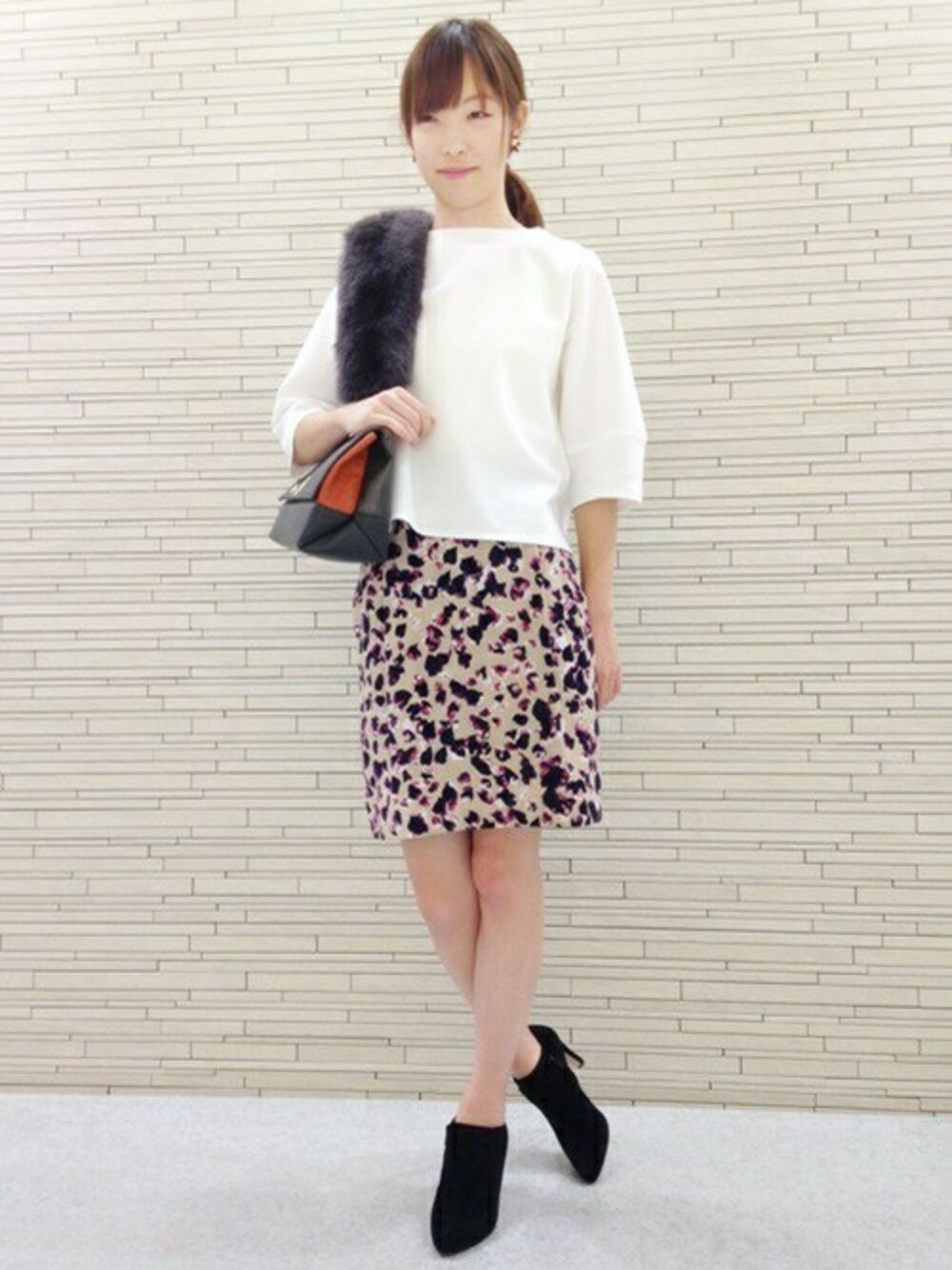 スカートはゆとりのあるタイトシルエットなのでトレンドのスポーティーなトップスを合わせてもスッキリ着こなせます。 ファーを合わせれば上品な秋の装いに。 ピンクの花びらのプリントはオフィススタイルにも映えますね!