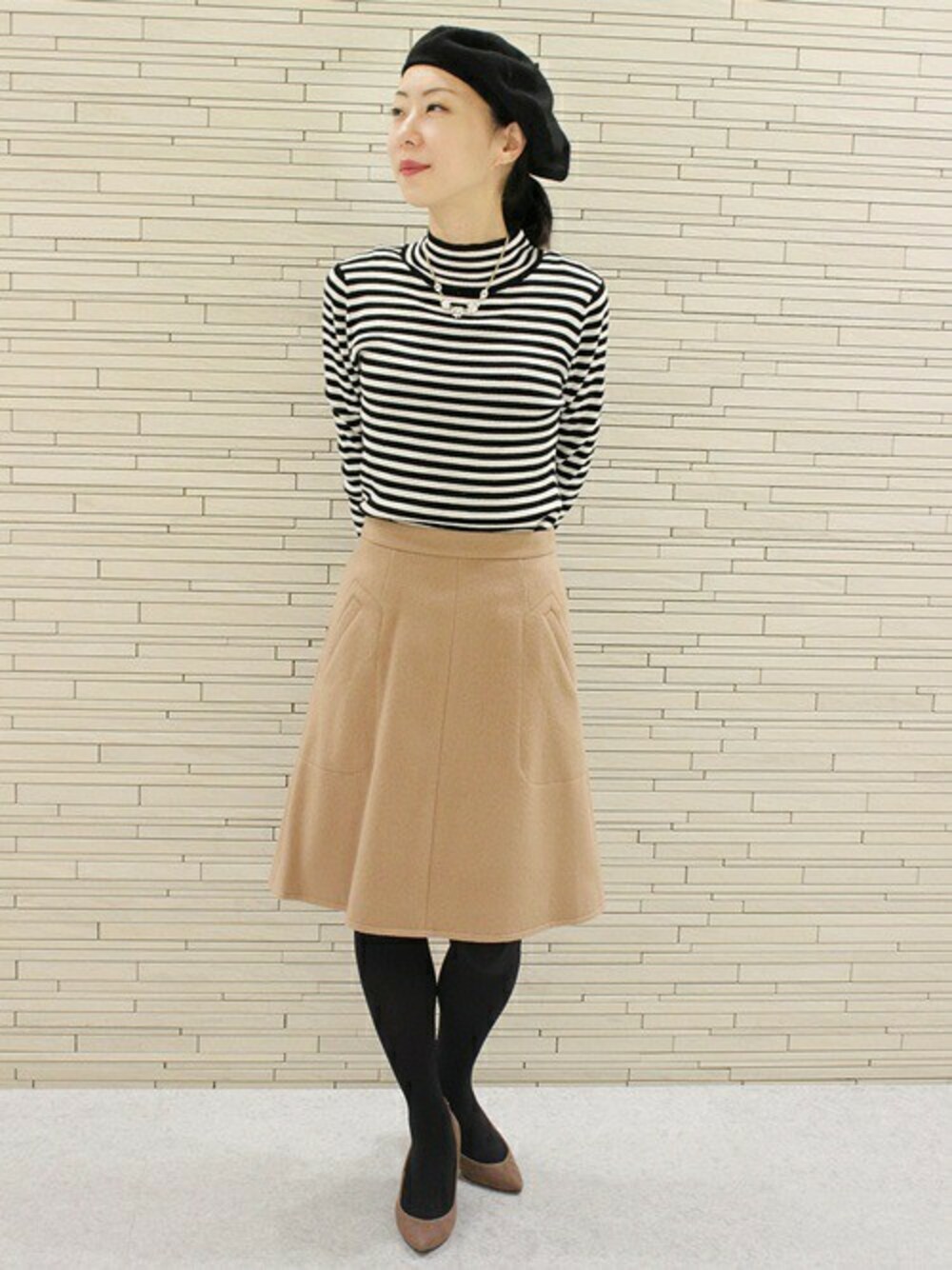 リブのハイネックニットにベレー帽を合わせてみました。スカートは、ポケットもついてる履きやすい着丈の長さです。