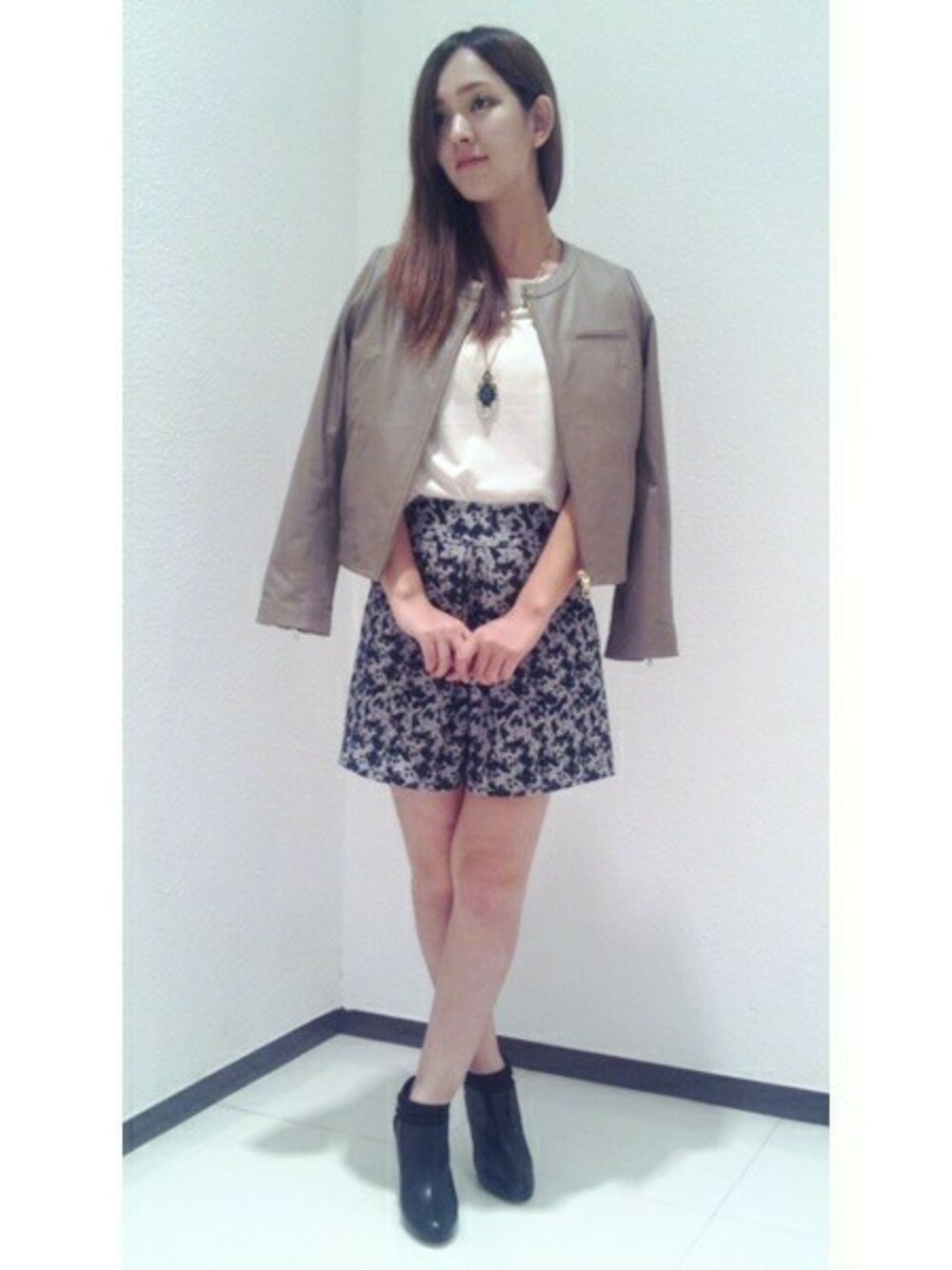 ヒョウ柄のような感じの生地で、 素材感のある素材を使用したショートパンツに 定番のレザージャケットを合わせてみました。