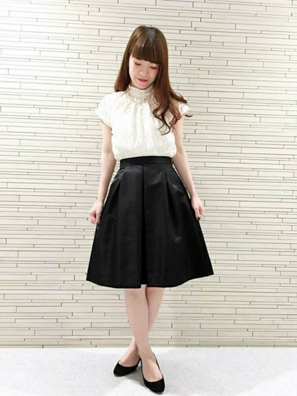 ラ トータリテらしいエレガンスを全面に出したスタイリングです。合わせてるスカートは艶とハリが綺麗なタックスカートです。 こちらは定番のホワイト×ブラックの組み合わせ。 定番スタイリングだからこそ、冒険がしやすいですよね!