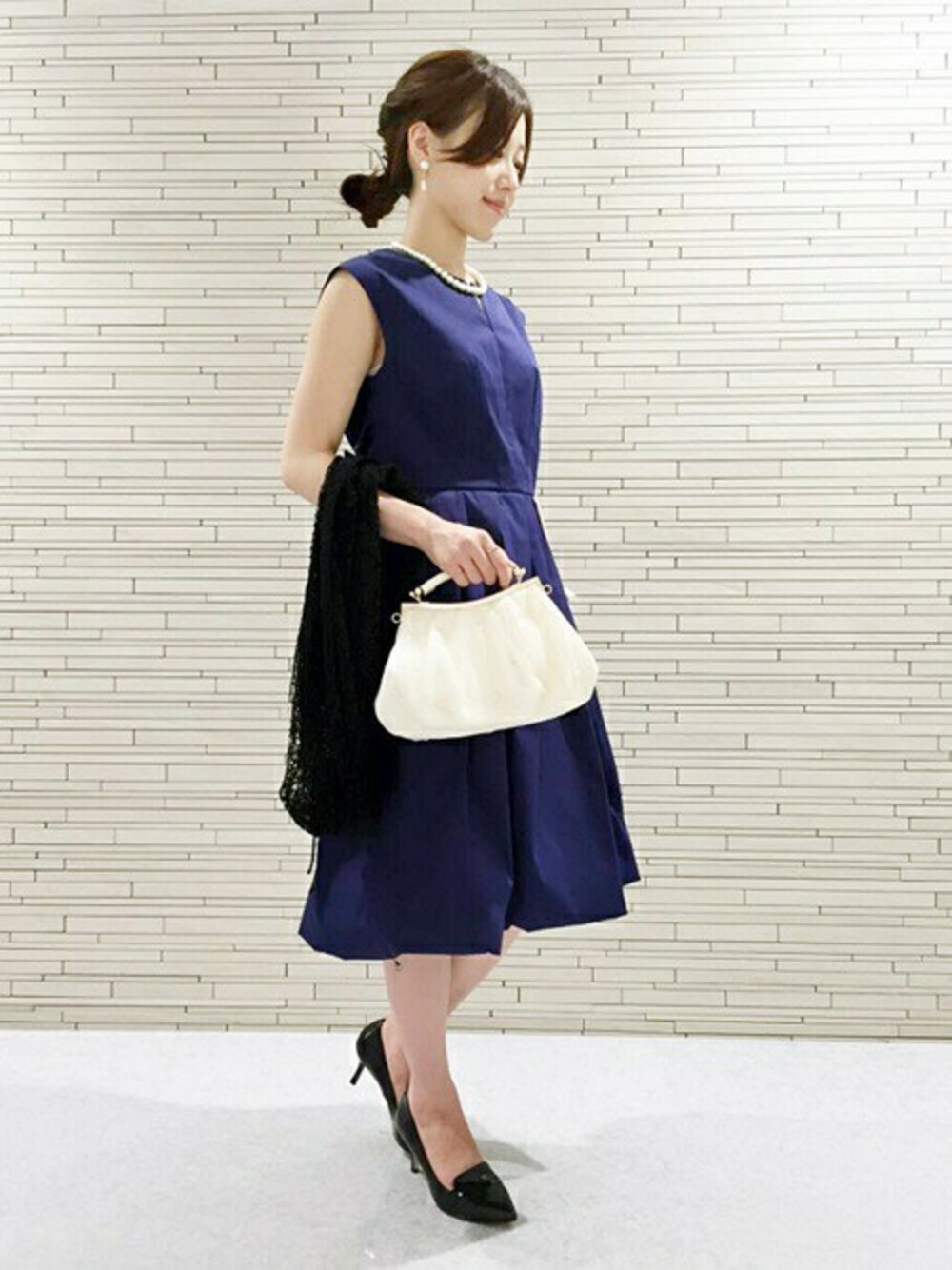 深みのあるブルーが印象を際立たせてくれます。 スカート部分はバルーンシルエットになっております。 清楚な白の小物でまとめました。
