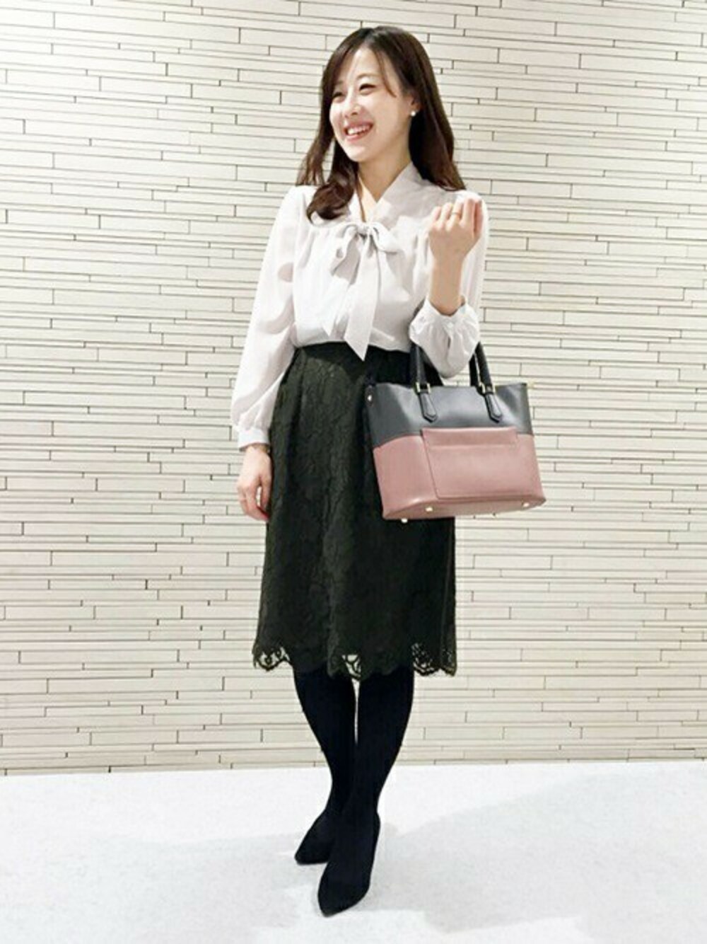 ブラウスはウエストインして、すっきりと着こなして頂くと素敵です。 また、通勤スタイルにすぐ取り入れていただけるレーススカートもおすすめです。