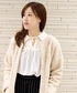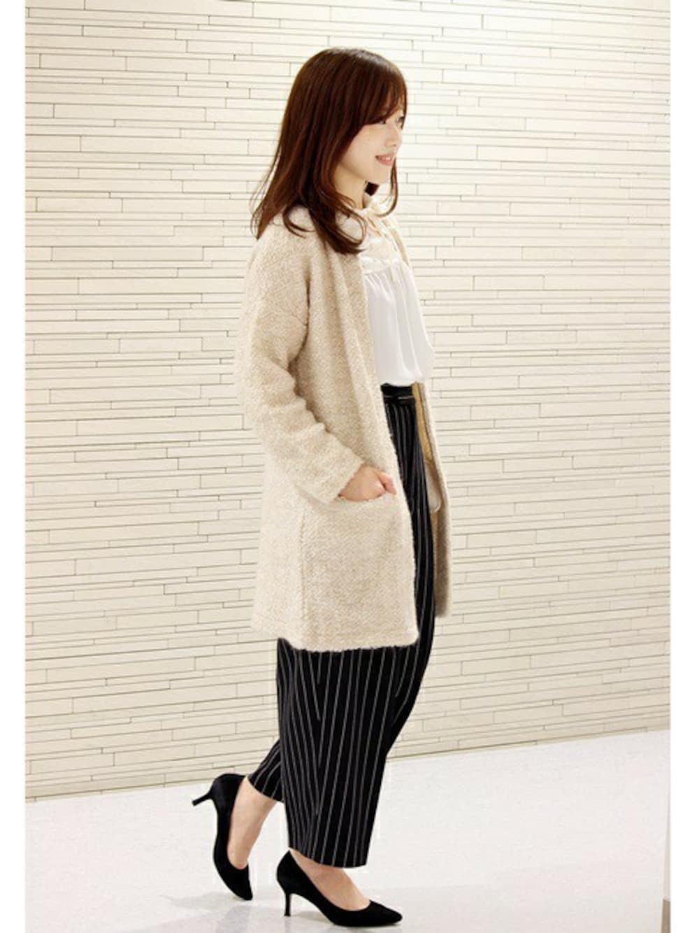 フォークロアテイストのブラウスに、ローゲージカーディガンとワイドパンツをあわせてきれい目に。