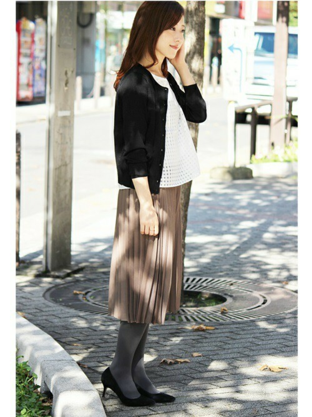 ブラウスとセットになったカーディガンには、プリーツスカートでフェミニンなスタイルに。オフィスでも活躍します。