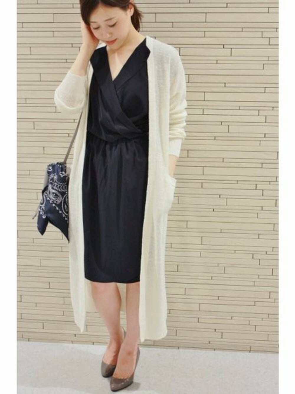 ワンピースに軽やかなリネンのロングカーディガンを羽織って。 縦長のシルエットが今年らしいスタイリングです。