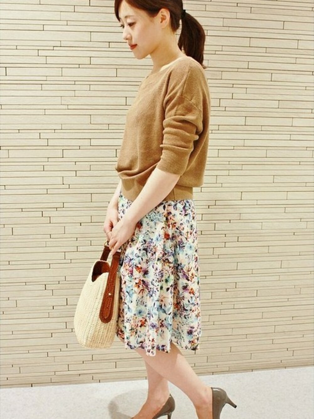 キャメルのニットとフラワープリントで大人かわいいコーデ。 カゴバッグでカジュアル感をプラス。