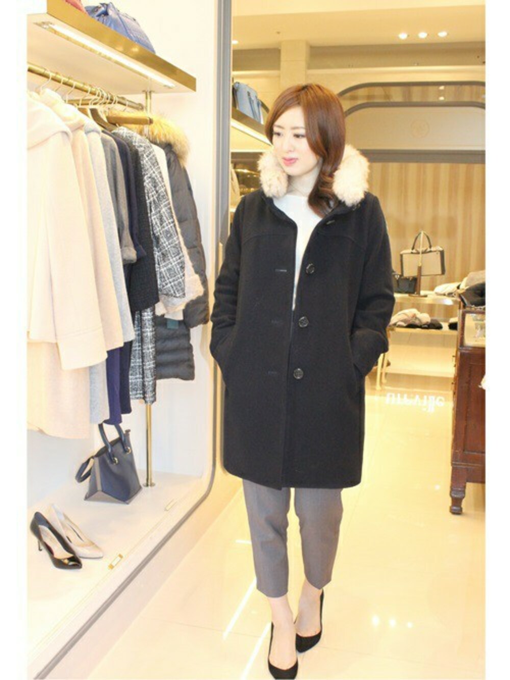 首回りにラムのファーを配し、見た目も暖かそうなウールコート。ファーは取り外しが可能なので、その日の気分にあわせてコーディネートできます。スタンドタイプなので、寒気も防ぎ暖か。デイリーでお使いいただけるコートです。シンプルなニットは、背中の首元がポイントです。
