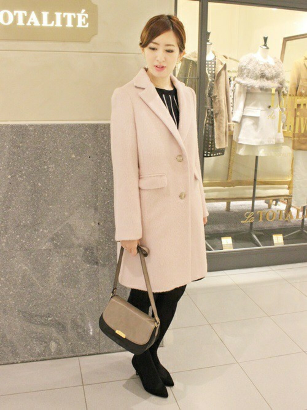 やわらかいシャギーを使ったチェスターコート。お顔まわりが明るく華やかになるカラーが気分も上がります。今年マストのストライプニットとスタイリング。ポシェットのような小さ目バッグがあると雰囲気が出て可愛いですね。