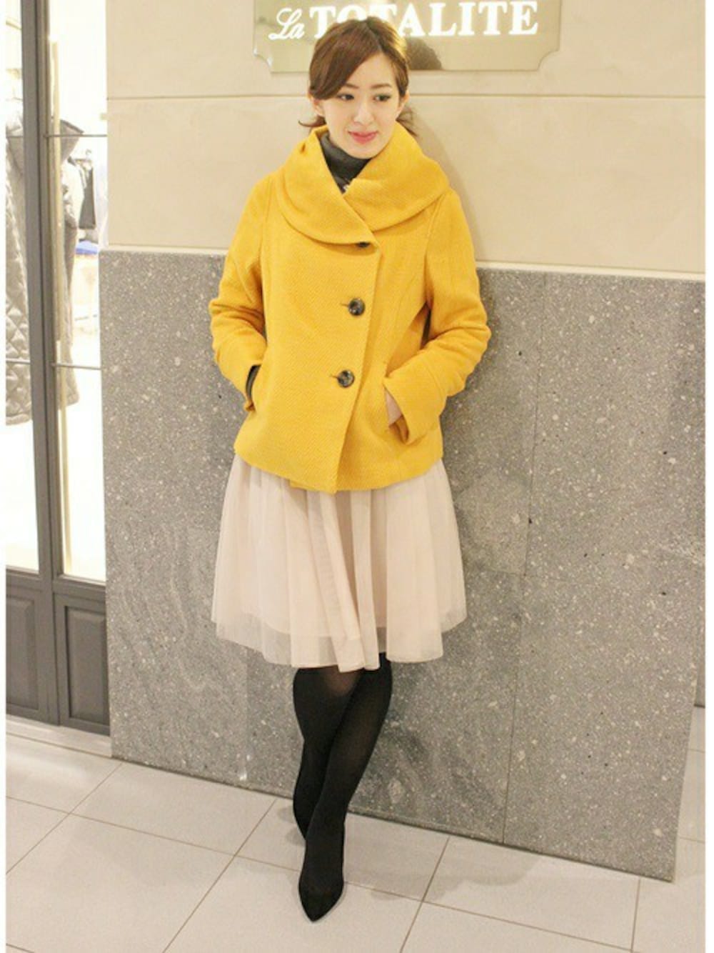 肩までかかるようなエリのデザインが、とても女性らしいコートです。ショート丈なので、かさばらずさっと羽織れる楽ちんタイプ。バランスが取りやすくデイリーで着回ししやすい一枚です。ミモレ丈スカートなどのコーディネートには、こんなショート丈が◎。