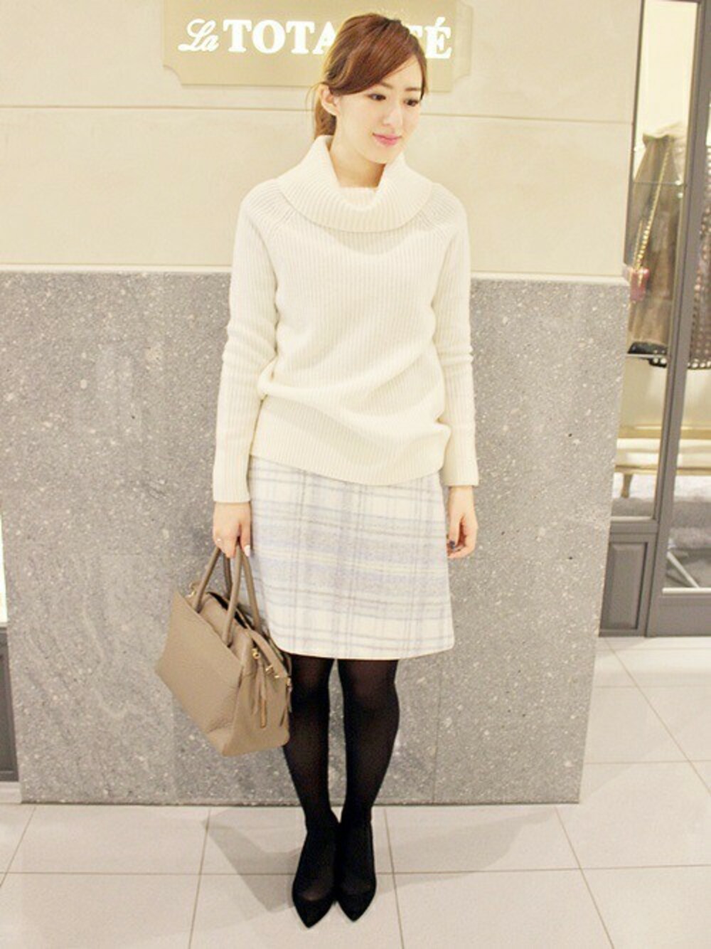 淡いきれいなカラーのチェックスカートに、今年マストなざっくり編みのタートルニットでコーディネート。オフィスカジュアルとしても◎。