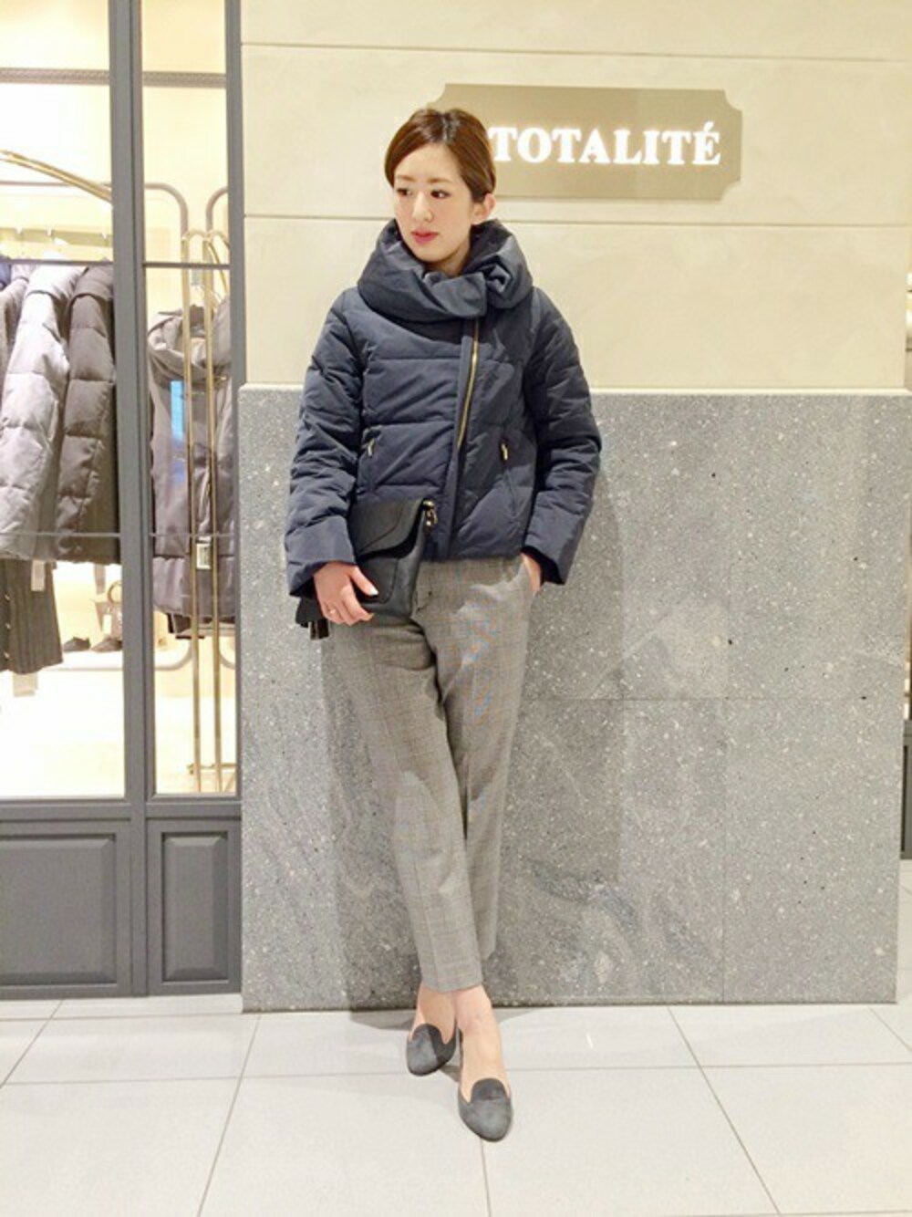 クラッチバッグを持つと、カジュアルなダウンコートもモードな雰囲気に変わりますね。