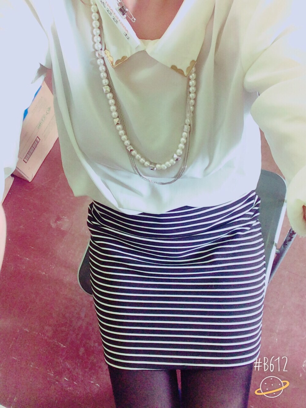 ホワイト系のシャツ/ブラウス、ブルー系のスカートを着用したレディースの春コーディネートの1枚目の写真
