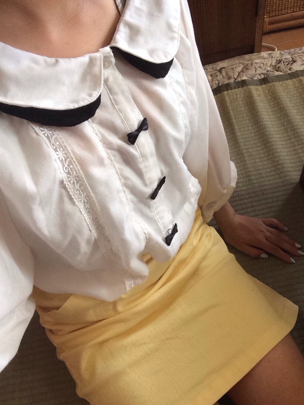 お盆してまーすv(^_^v)♪ ばあちゃんち来たから落ち着き目に♩♩ 下はタイトスカートになってるのです! 高校生の割りには大人びてみた><// 大好きな黄色なので大人すぎず、気にいっております💕💕