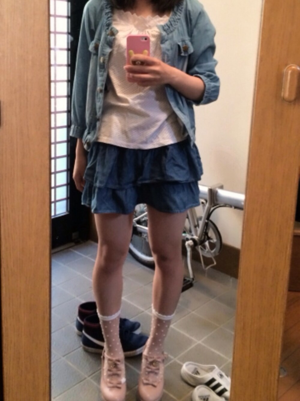 デニムをセットアップ風に着てみました\(//∇//)\中は白にドットのタンクトップです\(//∇//)\