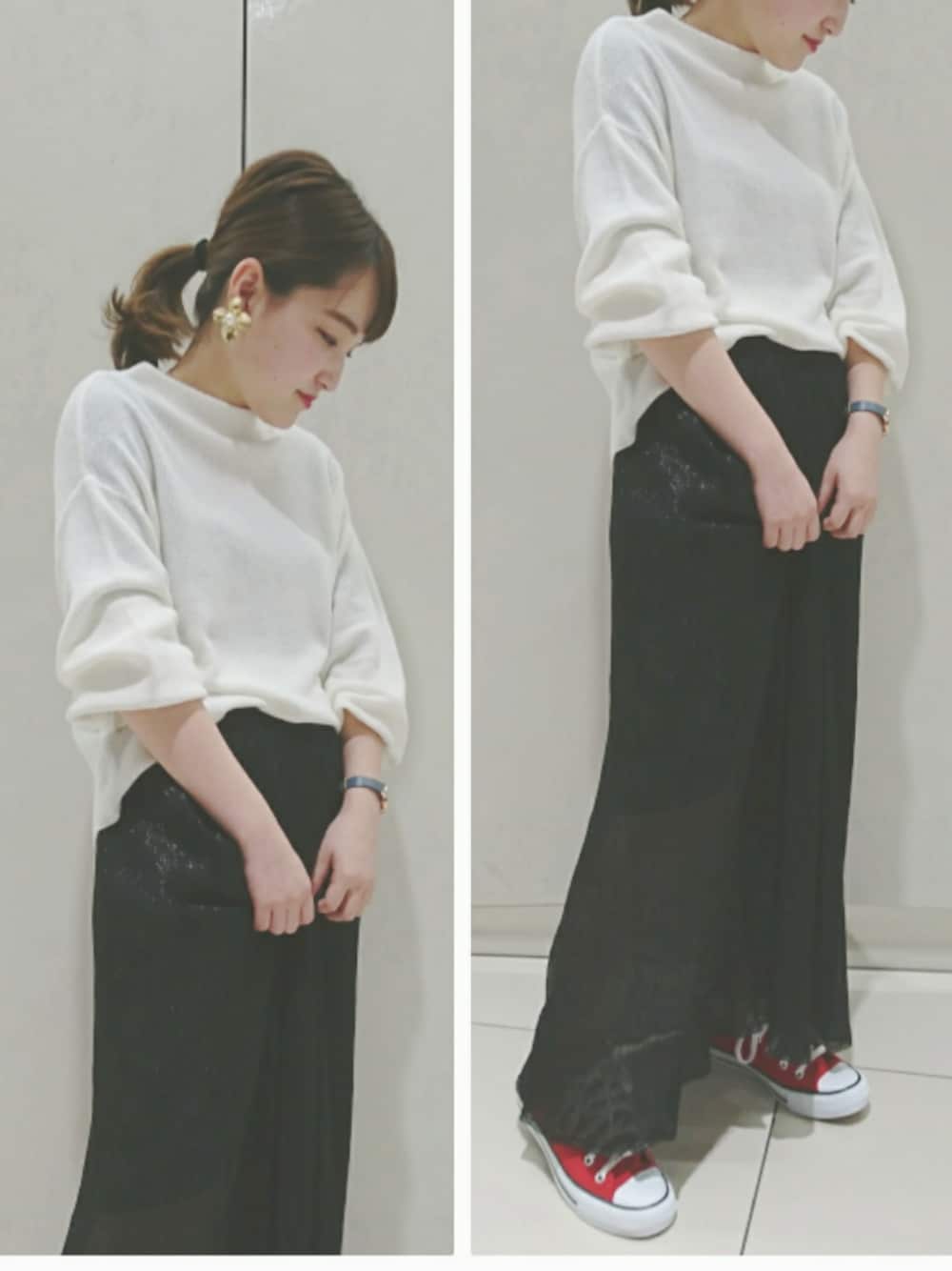 プチプラコーデです ニットは薄手で春まで使えます 長めですっきりとした丈です スカートで着るときは前だけインすると バランスが取りやすいですよ スカートはウエストゴム ラメが入っていて黒でもとても軽い素材です 膝下に透け感があるので春でも着れますよ