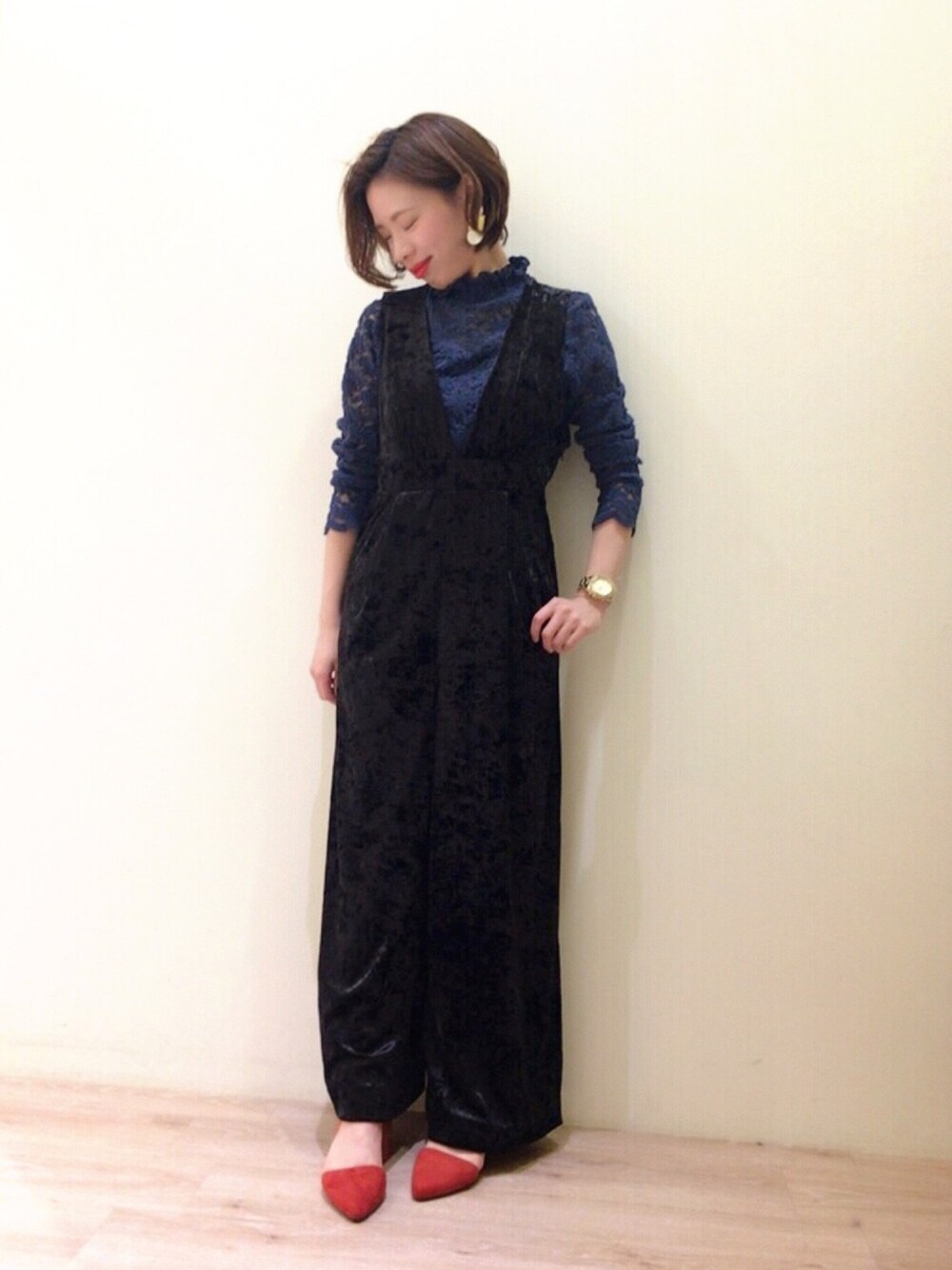 ベロア素材のコンビネゾンはパーティーシーンにも大活躍✨ 靴やバッグで差し色をプラスしてぐっとオシャレに✨ ファー小物はさりげなく取り入れると😌💓