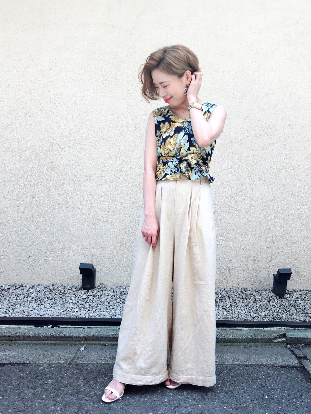 🐰インスタ始めました!🐰 @tarutani_labo 人気の羽根柄セットアップのトップス着回しコーデです😌💓 着丈が少し短めなのでハイウエストのボトムと合わせると、かなりのスタイルアップ効果が👀✨ ワイドパンツは柔らかい手触りで着やすいので愛用中です🐰