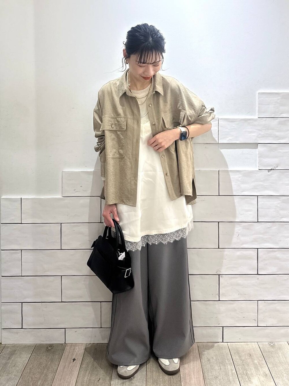 トレンドのレースキャミは カジュアルなアイテムと合わせるのが◎ スエードシャツは前が短めで バランスとりやすく 低身長さんにもオススメ。