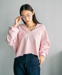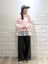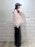 春らしいピンクのトップスは グレー合わせが甘すぎなくて◎ 寒い時期はハイネック合わせもオススメ。 ボトムはタックのないストレートなシルエットで すっきりした印象に。