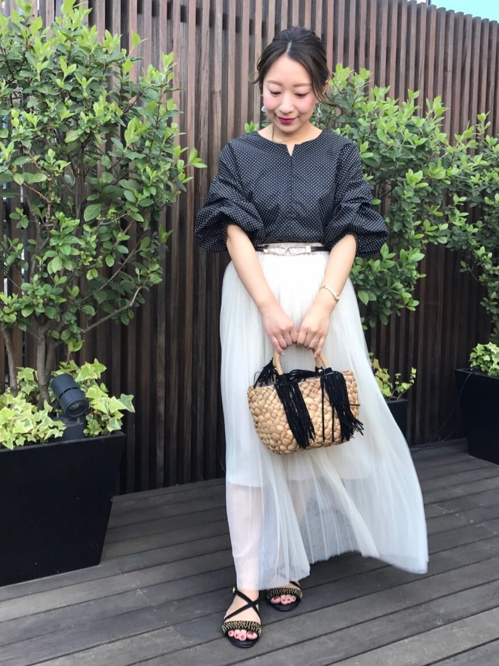 トップスはよく見るとドット柄になっています☆ 小さめドットなら甘過ぎず大人カジュアルに着られるのでオススメ! シフォンスカートは裏地が短めなので、低身長でも重く見えないのが嬉しいです(^^)