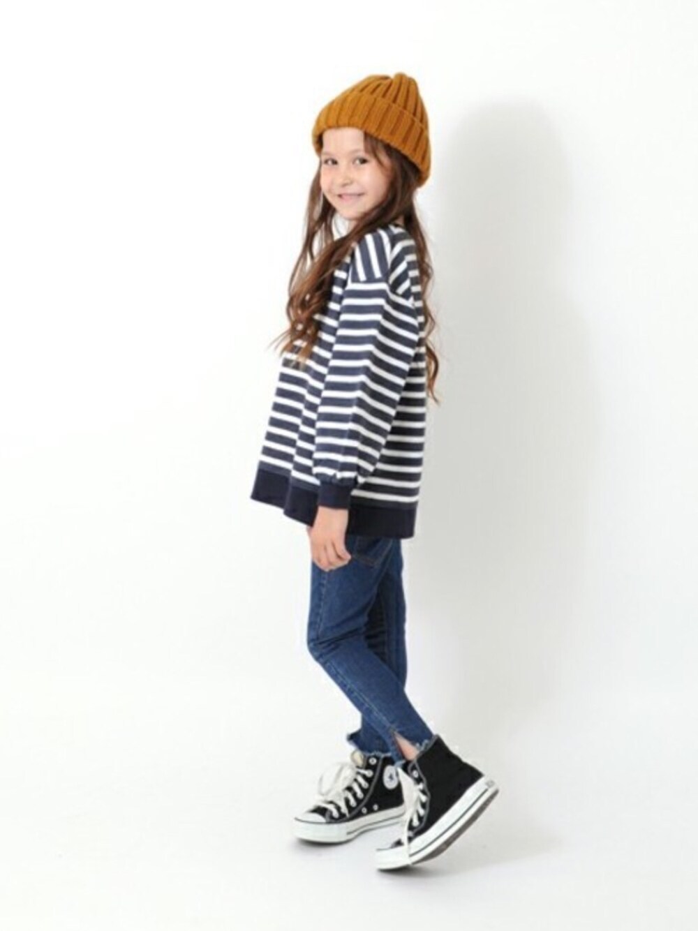 いつも見ていただきありがとうございます◎ オシャレな通園通学コーデ*** ボーダーのトレーナーは、ゆるっとサイズでシンプルだから着回し力抜群! 袖にボリュームを出して、女の子らしさをプラス♡ 裾にスリットがあり、インナーとのレイヤードストタイルもオススメ♪ パンツは大人気のデニムスキニーパンツ。 オールシーズン着れる優れもの◎ 裾スリットと切りっぱなしのフリンジがステキ♡ ハイカットスニーカーとの相性抜群です! トレーナーはカラバリ豊富なので、他のカラーも是非チェック✔︎してみてください♪ いいねやお気に入り、いつもありがとうございます*** 【 身長 121cm / 体重 20kg 】