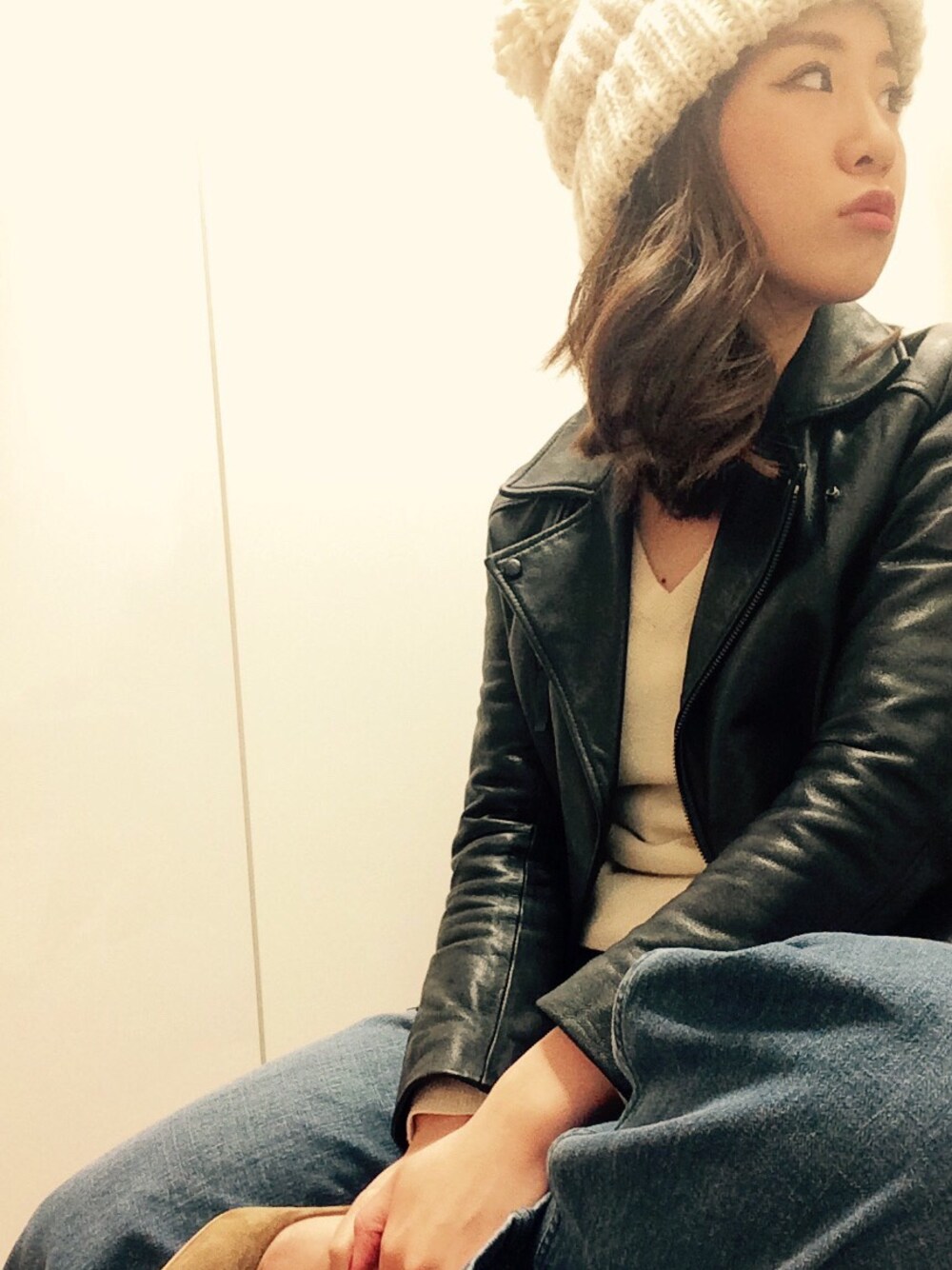 ライダースがちょうどよい気候^ ^ ニット帽はポンポンでかくて気にいってる。