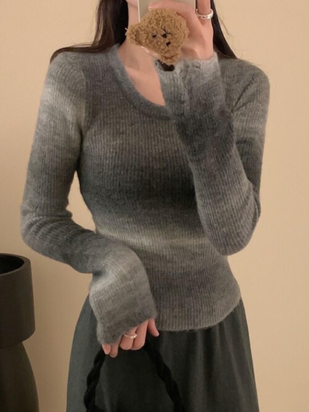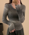 グラデーション&タイトシルエットが気分にマッチ グラデーションボーダーが目を惹くニットトップス。 リブ編みが体にフィットしてスタイリッシュなシルエットを作り出します。 袖口はダメージ加工が施されており個性的な印象に。 柔らかなニット素材で季節の変わり目にもピッタリです。 スッキリとした短め丈でハイウエストボトムと好相性です。 一枚での着用はもちろん、アウターと併用しても映える主役級トップスです。
