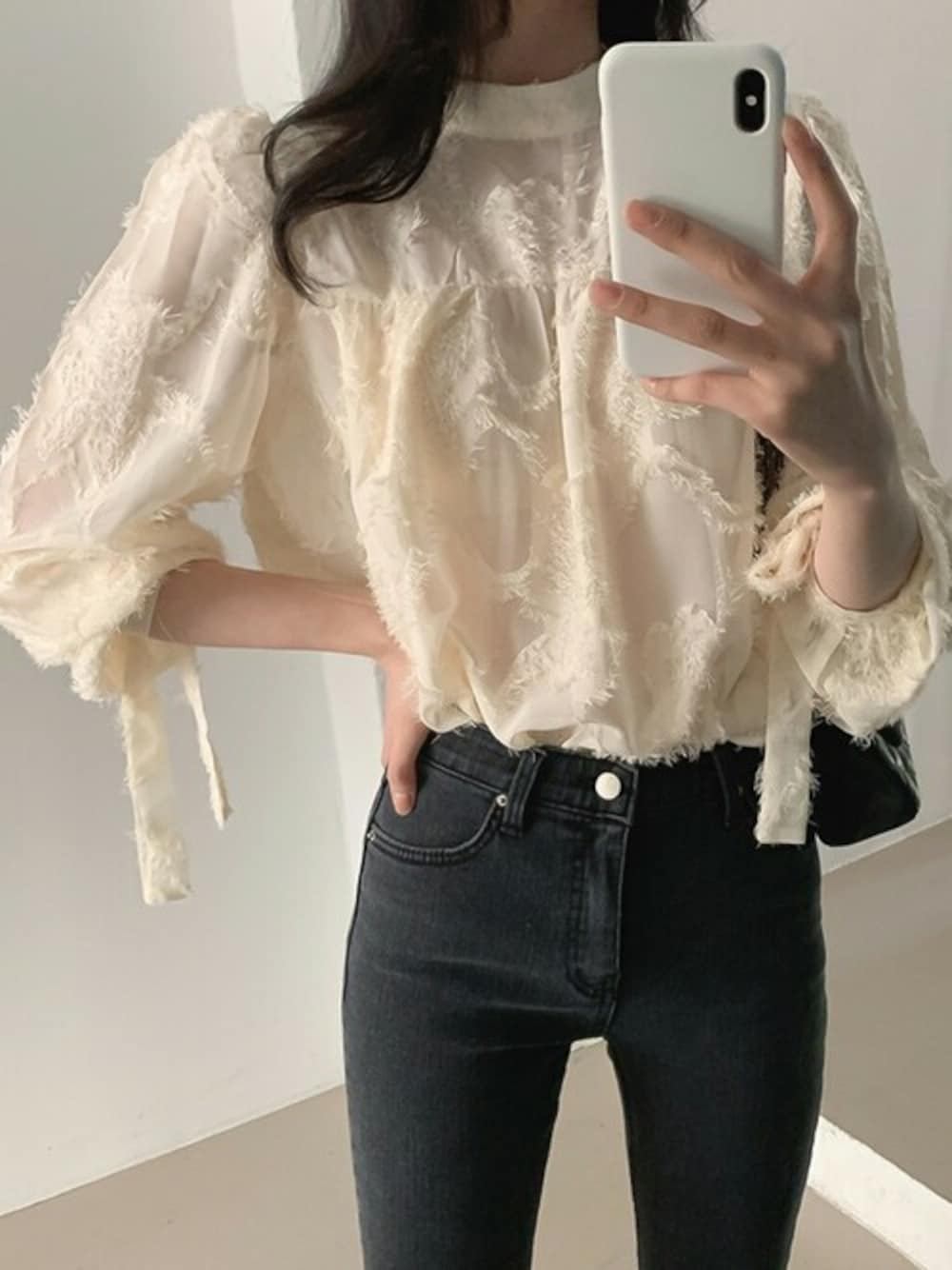 カットジャガード素材を使用した華やかな7分袖ブラウス 表情のあるカットジャガード生地を使用したブラウス。 毛足&シアー感があり着映えアイテムです! ふんわりしたフォルムと袖口のリボンが華やかな印象に。 スタイリング存在感のあるデザインで1枚でサマになるアイテムです。 デニムに合わせてカジュアルに、フレアスカートでフェミニンスタイルにも!