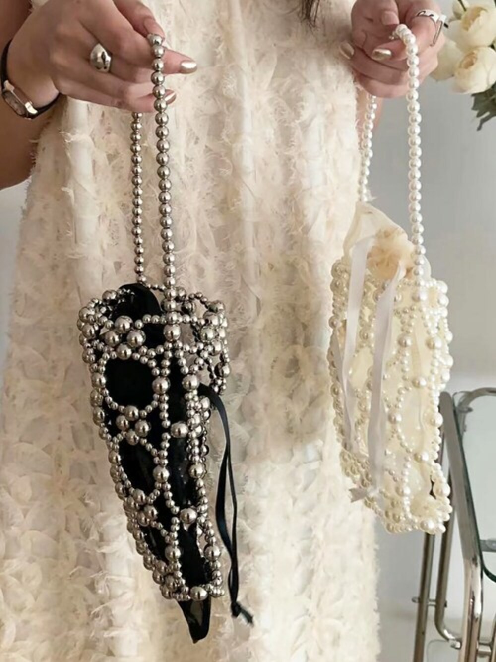 アクセサリー感覚で持てるビーズバッグ コンパクトなサイズ感ですが、ミニウォレットやスマホ、リップなど収納可能です。 コーデのアクセントにアクセサリー感覚で持てるビーズバッグ◎ 普段使いはもちろん、結婚式などフォーマルなシーンにもおススメです。 キラキラとした素材感でオケージョンシーンにピッタリです。 カジュアルなコーディネートのアクセントにも◎