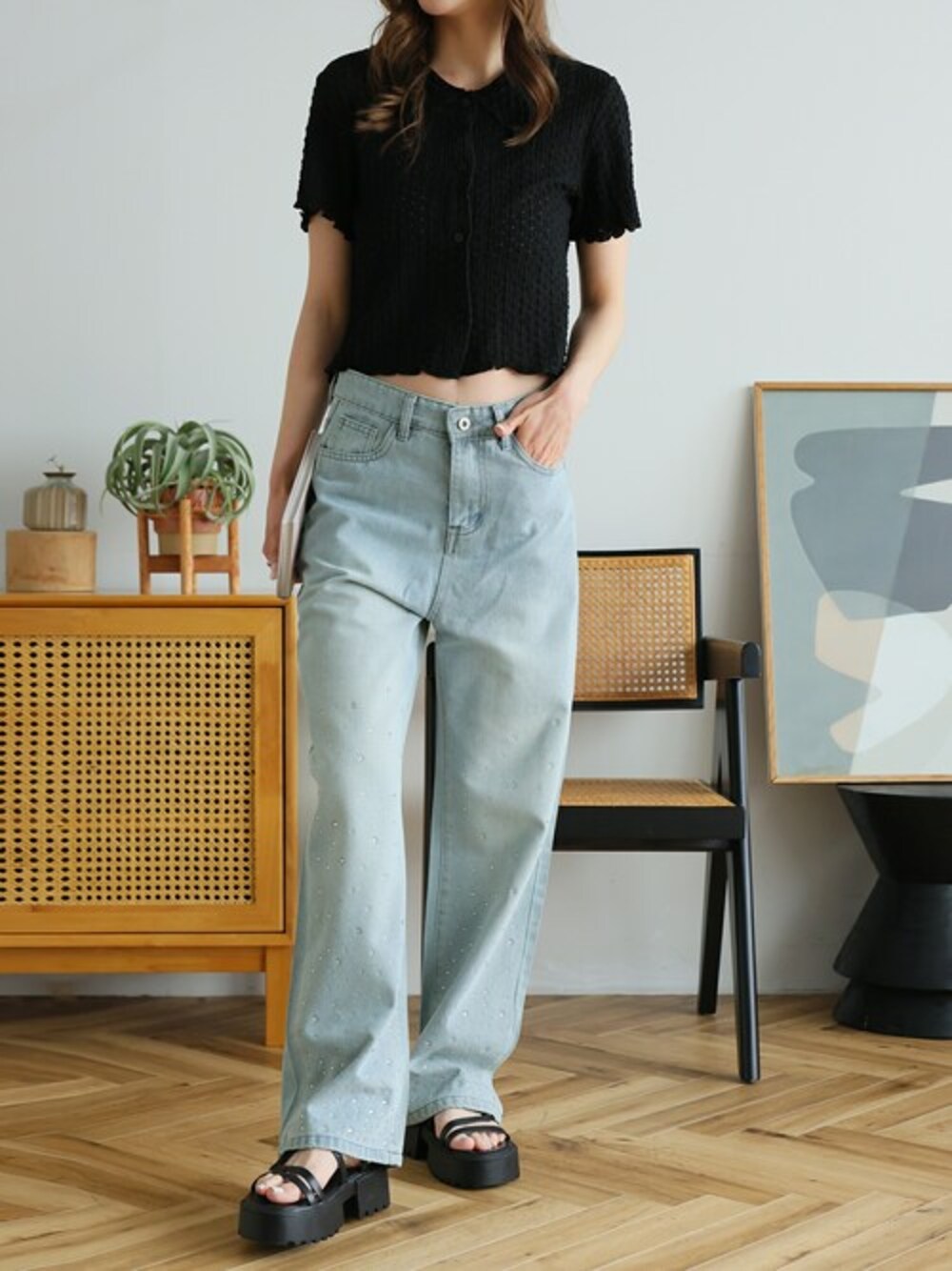ビジューでフェミニン×カジュアルなデニムパンツ フロントに散りばめられたビジューがポイントのデニム。 シルエットはカジュアルに穿けるゆとりのあるシルエット。 着るだけでシーズンムード高まる装いが完成♪ オールシーズン使えるデニム コーデの主役になるデニムなのでシンプルなニットやスウェットでスタイリングしてもサマになります。 カジュアルなデニムにフェミニンなビジューを合わせたアイテムでどんなスタイリングにもハマる主役級デニムです!