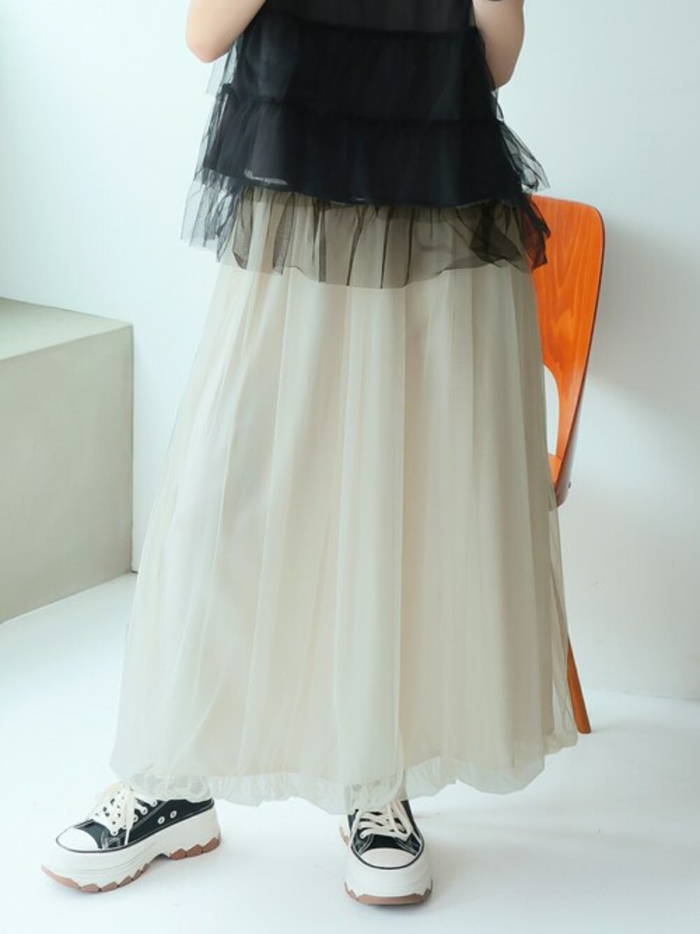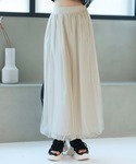 ちょうど良い透け感が涼しげなチュールスカート 柔らかくボリューミーなシルエットが大人可愛いスカートです。 マキシ寸で落ち着いた雰囲気。 サンダルだけでなくスニーカーでカジュアルに着こなすのもおすすめです。