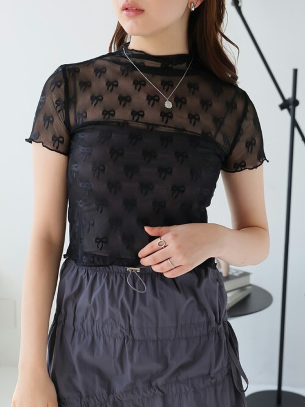 LM(LAFFMO)のTシャツ/カットソー「リボン柄ハイネック半袖シースルートップス」を使ったコーディネート