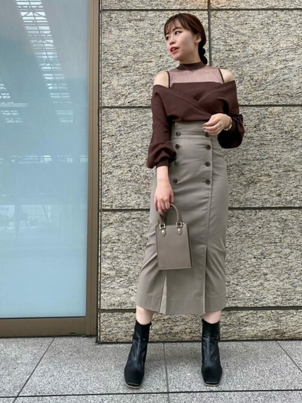 @lagunamoon_kaho ボトムを選ばず着ていただけるトレンド感あるニット! カシュクールの中はシアー感のあるノースリーブになっており抜け感を出してくれるので、冬はコートの中に着たいなー! カシュクールをずらして肌見せを調節できるのも嬉しい。 タイトスカートはラグナで毎回人気のミリタリー調のスカート。 ストレッチが効いており、タイトスカートとは思えないくらい楽な着心地です。