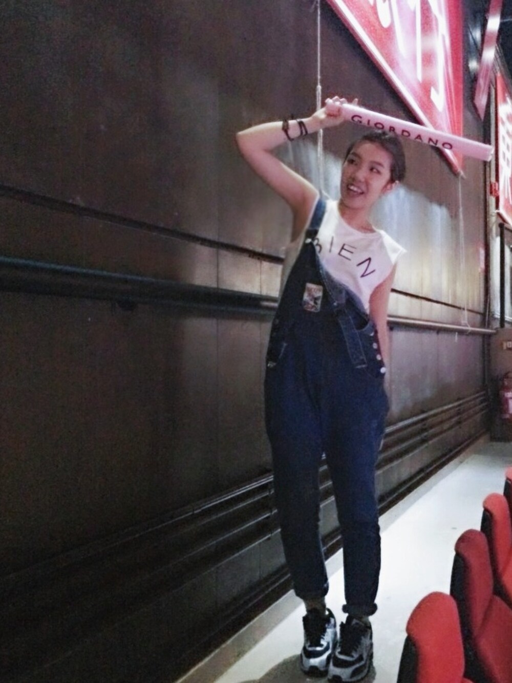 ブラック系のスニーカーを着用したレディースの秋コーディネートの1枚目の写真