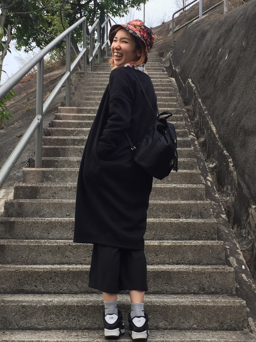 ブラック系のスニーカーを着用したレディースの冬コーディネートの1枚目の写真