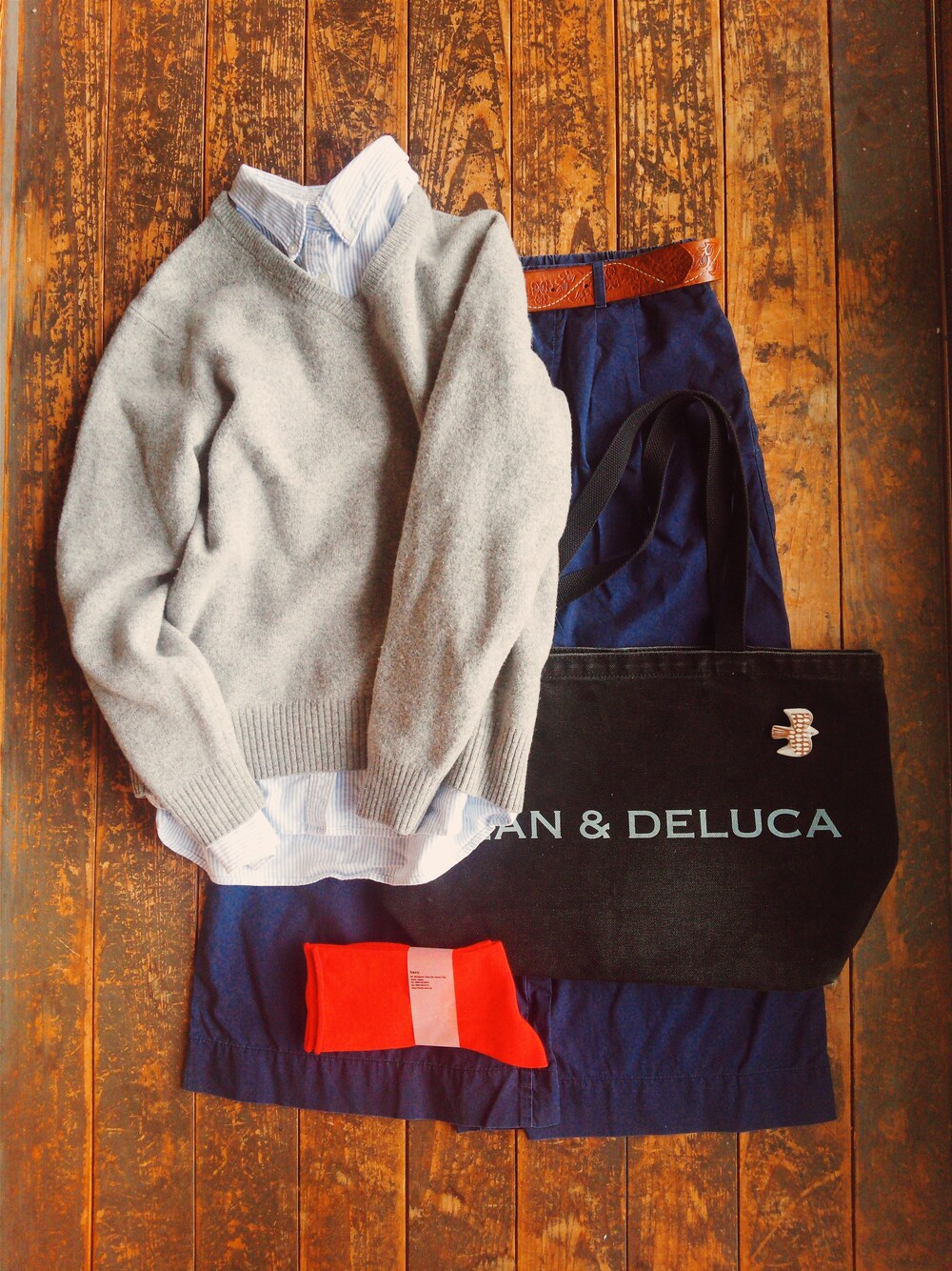 セーター、パンツ、ベルトがUNIQLO。 シャツが無印。 hacuさんの靴下、パキッとした赤でお気に入り。