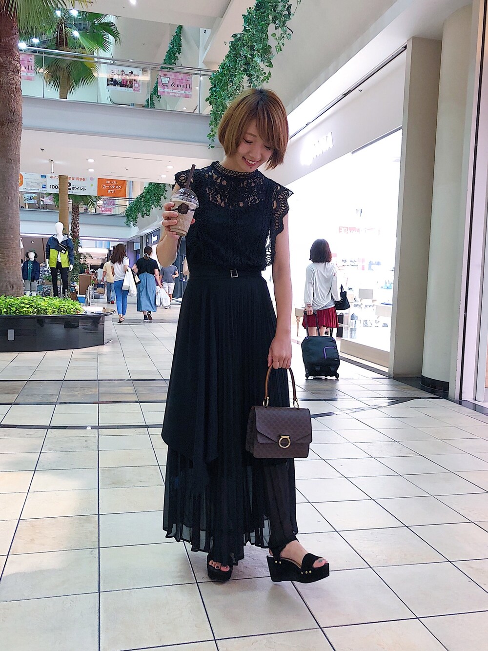. 家族とおでかけ♡ 全身ブラックで ちょっとドレッシーに😊 . アメリのスカートお気に入りすぎて 毎回はいてる!www
