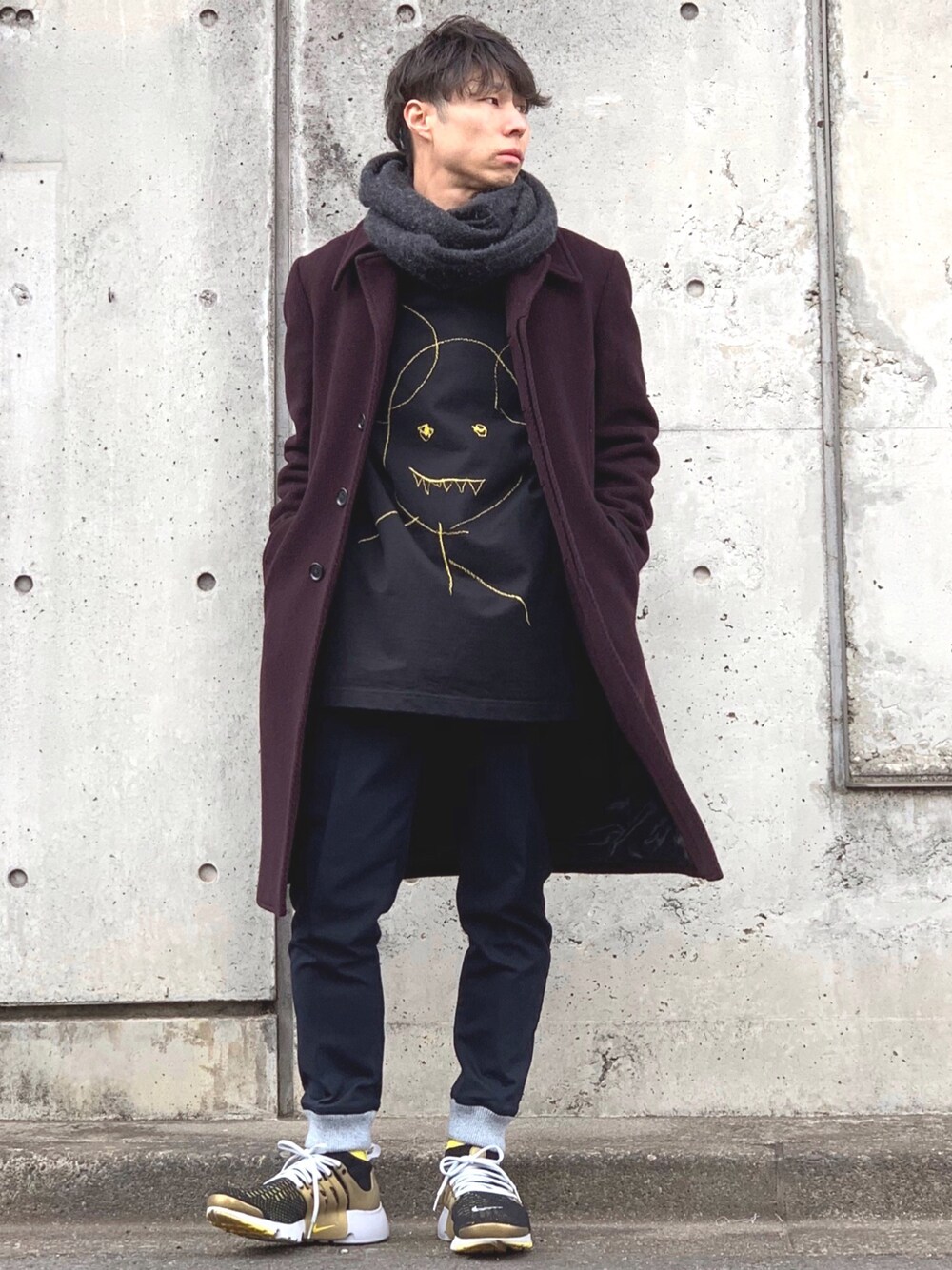 リップクリームを洗濯機で回してしまうことが多いけど僕は元気です☺︎ lamaです☻ 今日はLADのビッグT(ボブ)を主役にしたキレイめカジュアル★ コートは学生時代から着ているシリーズでzazousのフライフロントロングコート☻ ダークブラウンとワインレッドの中間みたいなカラーでめちゃ気に入ってます✨ スニーカーは知る人ぞ知るシゲキックス氏から譲り受けたエアプレスト👟 タートルやハイネックがトレンドだけど、僕は苦手なので首元はスヌードです★ ※もし過去投稿へコメントしたい内容や問い合わせがある場合、本当に気付かないことが多いので、最新投稿のコメ欄へお願いします🙇♂️ そして、フォロワーさん以外でsaveしてくれた方のところには48時間以内に必ずいきますよ!✨ 今日も見てくださり、ありがとうございます☺︎ today's music ◖|・o・|◗♪ Genesis / Hiroshi Watanabe