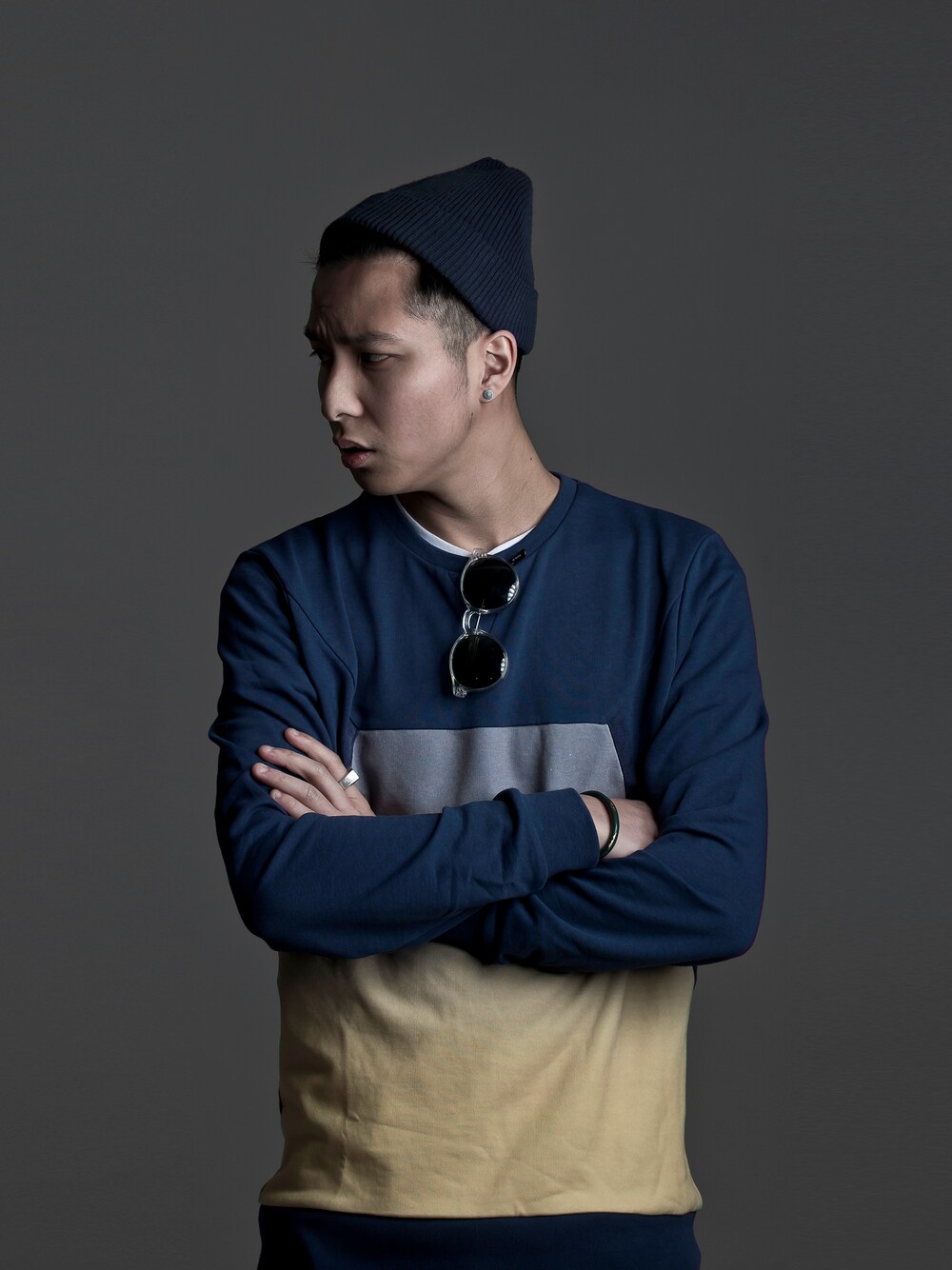 ブルー系のスウェット、ブルー系のニットキャップ/ビーニーを着用したメンズの秋コーディネートの1枚目の写真