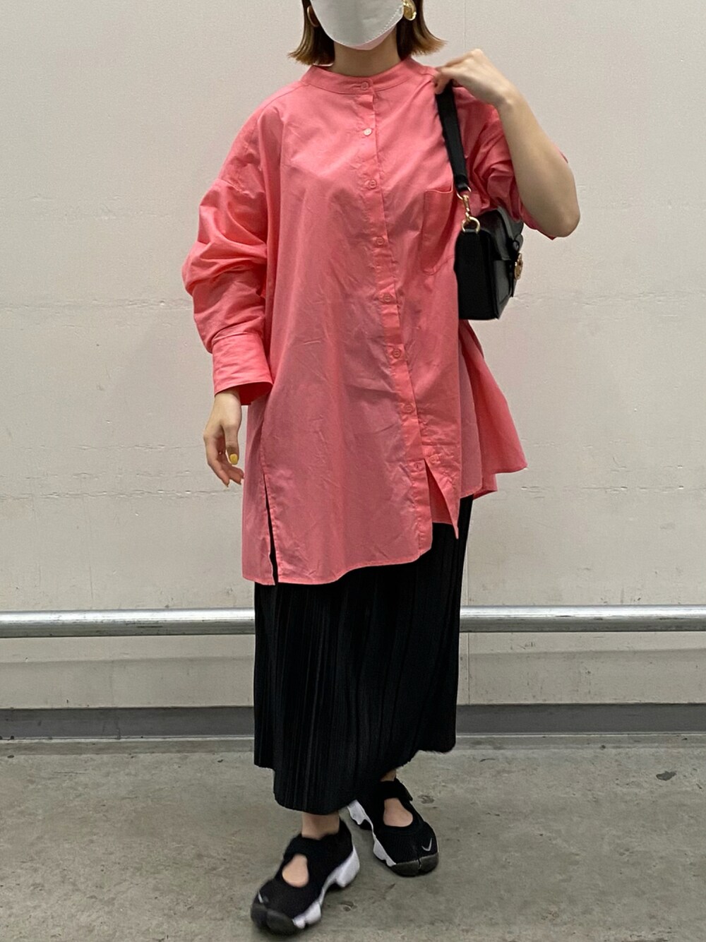 ピンクシャツでコーディネート👚👚 ピンクがド派手なので他のものは黒で統一して締めました‼︎ mysticのシャツはビックシャツなのでめちゃくちゃ体型カバーしてくれます‼︎ 上がダボっとしているのでGUのタイトめのプリーツスカートでダボダボにならないようにしました‼︎ nikeの靴はとっても歩きやすいので暑い夏の今のうちにたくさんはかなければ^_^