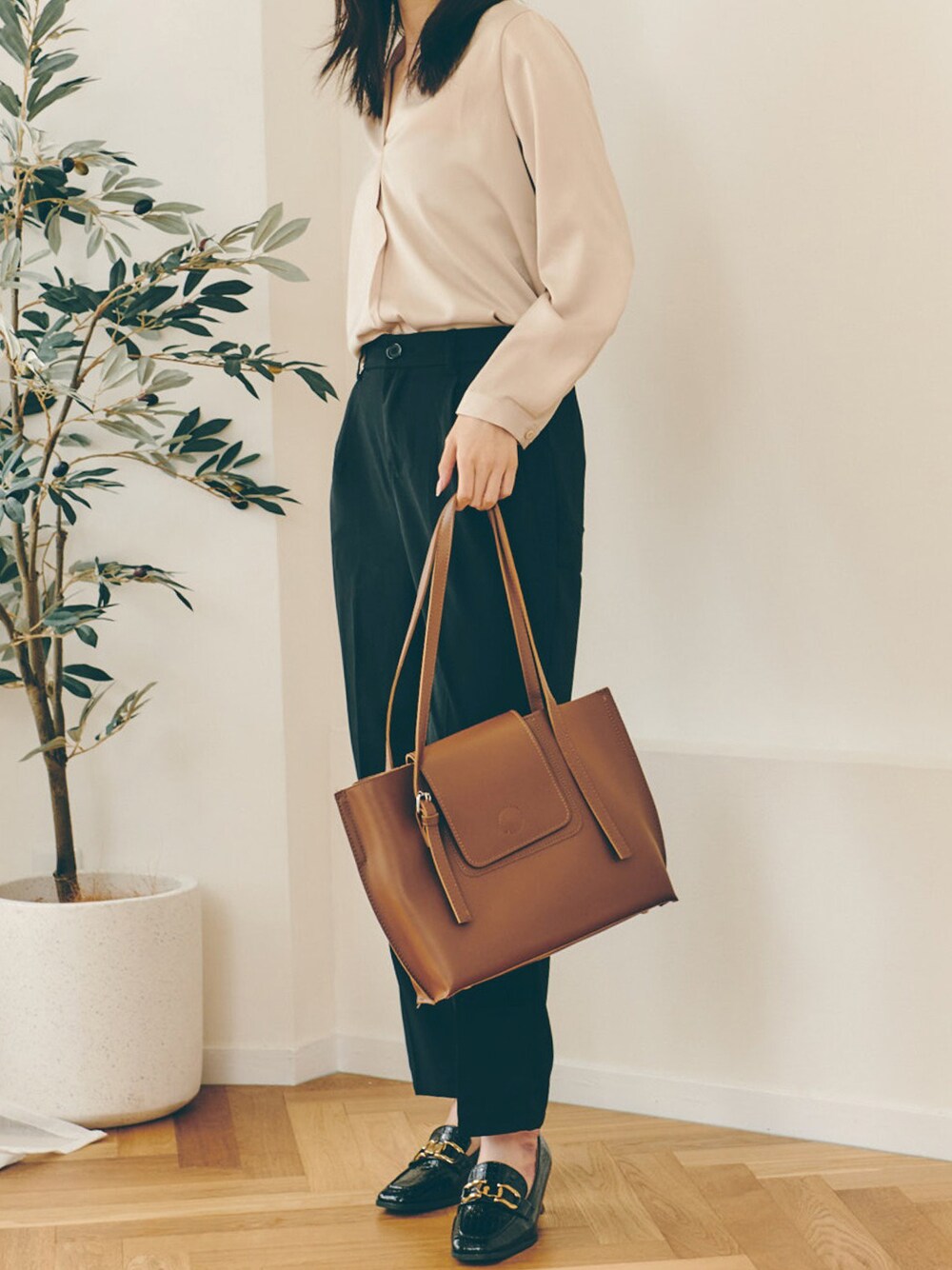 ご覧いただきありがとうございます💐✨ tops 着用サイズ:FREE シンプルながら美シルエットのきれいめブラウス。オフィスにも普段使いにも使いやすいです。 bottom 着用サイズ:LARGE 足首に向かって細くなっているテーパードシルエットでスッキリした印象で穿いていただけます。バックはゴム仕様です。 shoes 着用サイズ:38 トレンドのスクエアトゥを取り入れつつ、レトロで高級感のあるデザイン。疲れない太めのローヒールです。 bag ショルダー部分が長く肩掛けしやすいので仕事用や通学用にオススメのバッグです。中身が見えないのも嬉しいポイント。