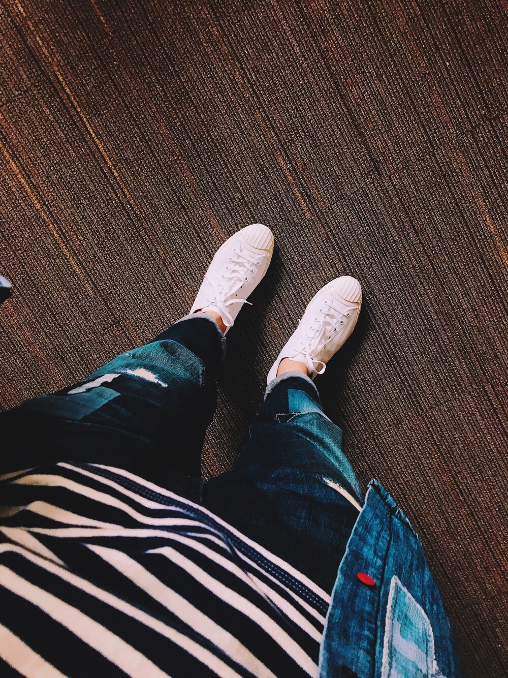 ストライプ T T シャツ~デニムジャケットとパンツの ほうそく 法則 に あわせ 合わせ て、 けいせい 形成 は とういつ 統一 のスタイル、 しま 縞 さく 作 インナー、 みばえ 見栄え は つっこん 突っ込ん で みえ 見え ない、 りゅうか 硫化 くつ 靴 ぜんたい 全体 の くみあわせ 組み合わせ すぎた はる 春 の いぶき