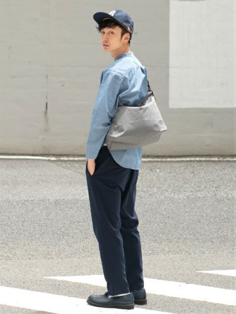 ネイビーとブルーでまとめた爽やかカジュアルコーデ。 ショルダーバッグのグレーをアクセントに。