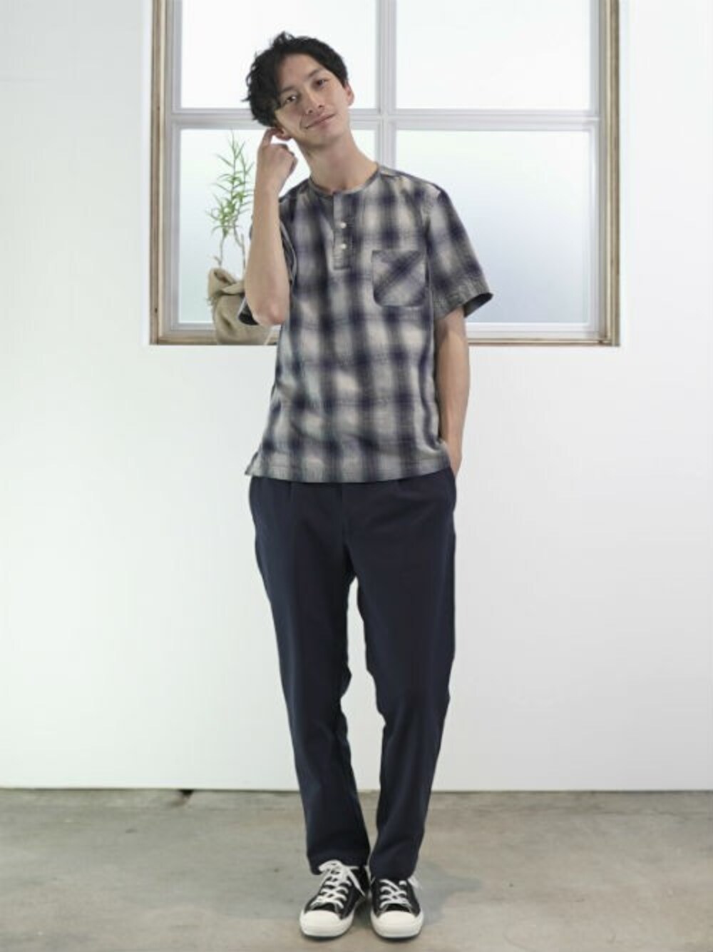 ちょっと可愛い印象になる襟の無いタイプのチェックシャツ。 スラックスはスウェット素材なので、履き心地抜群!履くだけで抜け感のあるスタイリングになります。