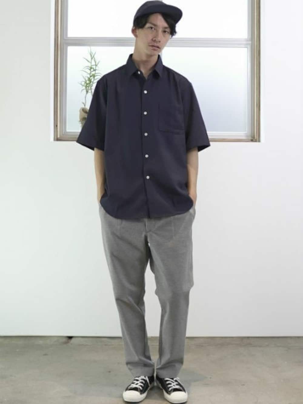 無地のビッグシルエットシャツはネイビーをチョイス。 パンツはスウェット素材のスラックスで、抜け感のあるスタイリングに。