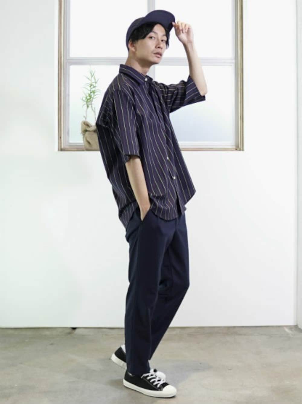 ネイビーでまとめたコーディネート。 ビッグシルエットのシャツは今年のマストアイテム。一枚着るだけで抜け感のあるスタイリングになるのが好きです。