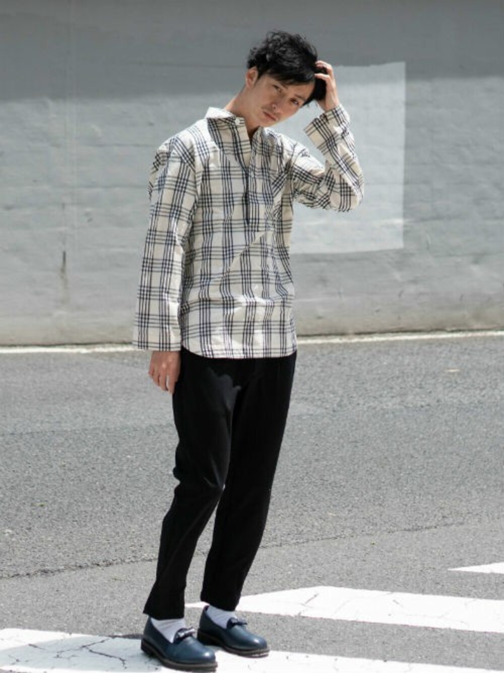 プルオーバータイプのコットンリネンチェックシャツで、ちょっと可愛い雰囲気のコーディネート。