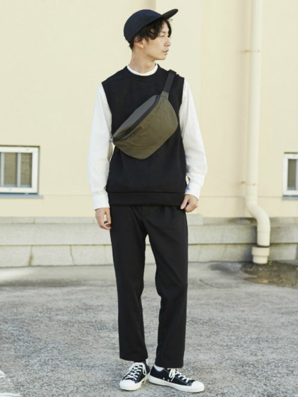 シンプルにモノトーンで合わせたコーディネートです。 オリーブカラーのボディバッグをアクセントにしました。