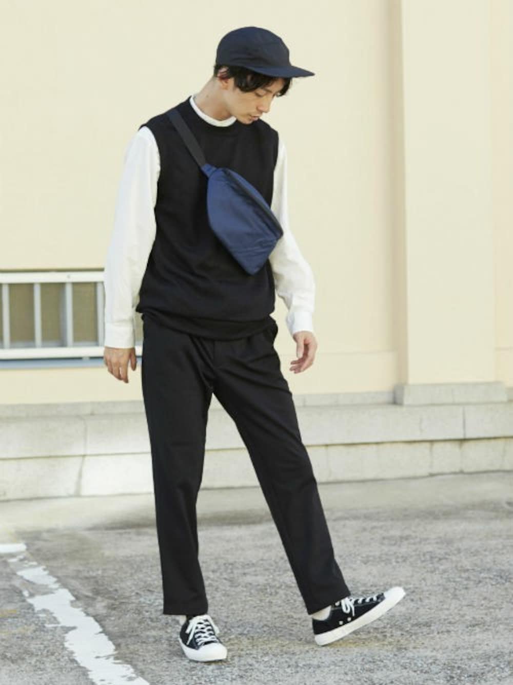 シンプルにモノトーンで合わせたコーディネートです。 ネイビーのボディバッグをアクセントにしました。 着回しのきくベストもお気に入り。