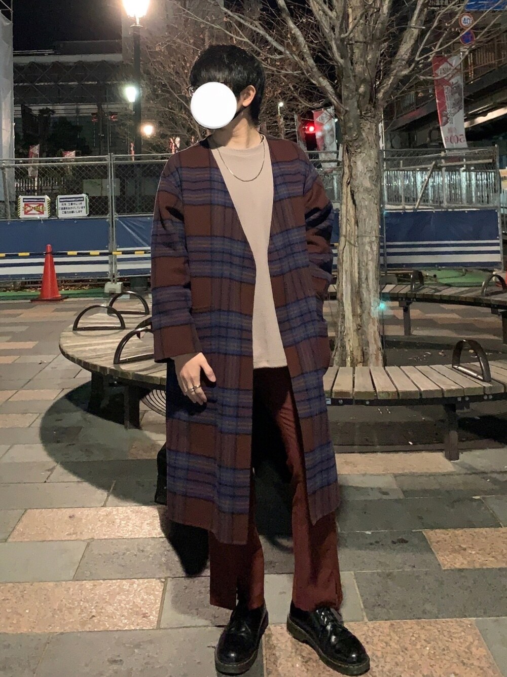 リバーシブルコートのチェック面をあまり着られてないのでなんとなく羽織ってみた このインナーとパンツの組み合わせが汎用的すぎる iPhoneで夜に撮ると画質ガビガビになるね